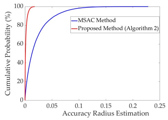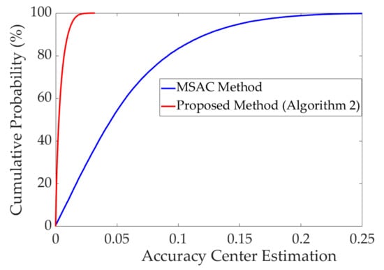 Cumulative probability distribution of the accuracy of the estimated center of the 50,000 simulated point cloud configurations using the MSAC and proposed methods.