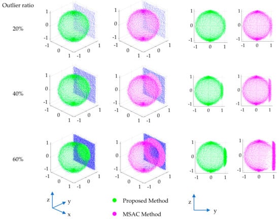 Figure 6 shows the results of the sphere detection using the proposed and MSAC methods for a sample sphere and plane point cloud for 10,000 points and noise level of 0.05 with outlier ratios of 20%, 40%, and 60%. It can be observed that, as the outlier ratio increases, the MSAC method includes many points of the planar patch as spherical. This trend was much less evident using the proposed method, which achieved satisfactory results. The latter phenomenon, i.e., the inclusion of points of the planar patch as spherical, is the reason for the lower recall rates of the MSAC method compared to the proposed method (as reported in Table 4).