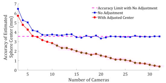 Figure 7 shows the accuracy of the 3D reconstruction of the spherical target using adjusted as well as the unadjusted center in images as a function of the number of image views. Two important observations can be made from Figure 7. Firstly, the accuracy of the estimated center of the sphere using the adjusted centers (the red curve) consistently falls below that without using center adjustment (the blue curve). This suggests that the average accuracy obtained using the adjusted center outperforms that without center adjustment.