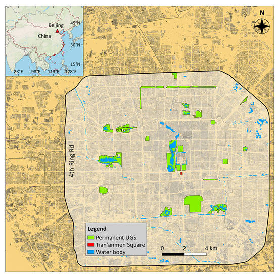 The study was carried out in permanent UGSs in Beijing located within the 4th Ring Road (Figure 1). These UGSs were identified from the Chinese urban park dataset by Li et al. [] and the Google historical images. We selected the UGSs that cover at least 100 Landsat pixels (approximately equal to 10 ha) because too small UGSs are easily affected by their surroundings and thus raise uncertainty. Formed before 1949, most of these UGSs are famous historical parks, e.g., North Lake Park and Coal Hill Park, consisting of abundant arbors, shrubs, herbaceous species and water bodies []. Due to their outstanding historical and cultural values, both landscape patterns and garden elements are well protected. Thus, these permanent UGSs provide us with a suitable testbed to quantify the long-term cooling dynamics of urban vegetation.