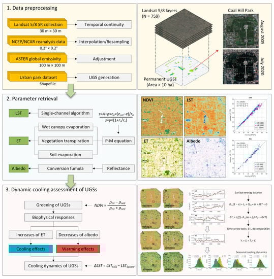 Figure 2 illustrates the overall workflow of the study. We first combined Landsat 5 and Landsat 8 surface reflectance datasets to form a long-term time series from 1984 to 2020. Next, based on the dataset, we retrieved four surface parameters including the normalized difference vegetation index (NDVI), LST, ET and albedo using different algorithms. Finally, we analyzed the greenness and cooling dynamics of UGSs and their biophysical responses using time series tools. Detailed descriptions of these steps are shown in the following sections.