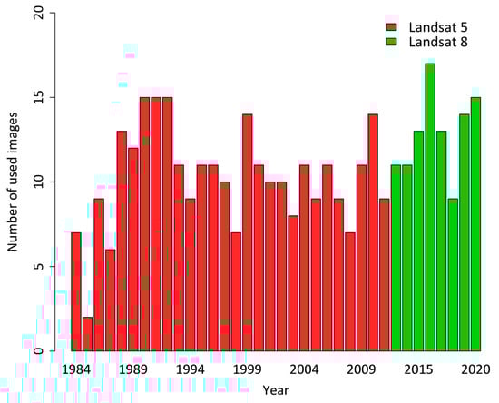 Number of Landsat images used for each year from 1984 to 2020. A total of 390 (287 of Landsat 5 and 103 of Landsat 8) images were used.