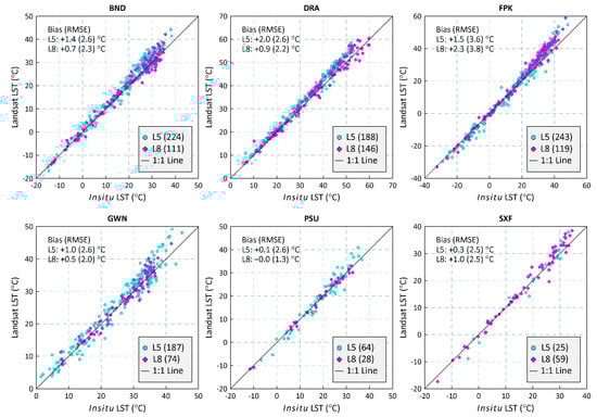 Scatterplots of Landsat-retrieved land surface temperature (LST) versus in situ LST at six SURFRAD stations (i.e., Bondville, Illinois (BND); Desert Rock, Nevada (DRA); Fort Peck, Montana (FPK); Goodwin Creek, Mississippi (GWN); Penn. State Univ., Pennsylvania (PSU); and Sioux Falls, South Dakota (SXF)). Parentheses in each figure legend indicate the number of observations used for validation. The data are from the years 1995–2020.