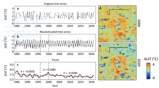 Dynamics of UGS daytime surface cooling. The figures in the left panel are (a) the original (defined as the LST difference between the UGSs and Tian’anmen Square) time series, (b) the reconstructed time series and (c) the extracted trend of . Each value is averaged from all pixels in the UGSs (Figure 1). The dashed lines indicate the breakpoints (1996 and 2000, respectively). The figures in the right panel are the mean annual composites from 2000 (d) and 2020 (e).