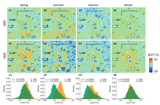 Dynamics of UGS surface cooling in different seasons. The figures in the first row are (a1) the (defined as the LST difference between UGSs and Tian’anmen Square) in the spring of 2000, (a2) summer, (a3) autumn and (a4) winter. The figures in the second row are (b1) the in the spring of 2020, (b2) summer, (b3) autumn and (b4) winter. The figures in the third row are (c1) the comparisons of the probability density distributions in 2000 and 2020 for spring, (c2) summer, (c3) autumn and (c4) winter with expectation (μ). The means of in spring, summer and autumn in 2000 were significantly larger (p < 0.05, t-test) than those in 2020.