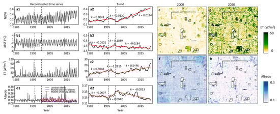 Dynamics of UGS evapotranspiration (ET) and albedo. The figures in the first panel are (a1) the reconstructed NDVI time series, (b1) the reconstructed time series, (c1) the reconstructed ET time series and (d1) the reconstructed albedo time series. The second panel shows (a2) the trend of the NDVI, (b2) the trend of the , (c2) the trend of the ET and (d2) the trend of the albedo. The dashed lines indicate the breakpoints (1996 and 2000, respectively). The third and fourth panels show the mean annual evapotranspiration (ET) (e,g) and albedo (f,h) composites from 2000 and 2020.