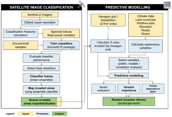 Aiming to address this gap, in this study we developed and tested a dual methodological framework for assessing landscape invasion by alien woody plants. The framework is illustrated for landscape invasion by the Golden wattle (Acacia longifolia) in a municipality of Northern Portugal. First, we developed an improved mapping approach based on Sentinel-2 imagery and stack fusion techniques with the R package biomod2 to generate a spatially explicit representation of invaded areas. Secondly, we used a predictive model-based procedure with the Random Forests algorithm to assess the influence on the invasion process of several hypothesized drivers related to (i) (bio-)climate, (ii) topography/geomorphology, (iii) soil properties, (iv) fire disturbance, (v) land use/landscape composition, (vi) linear landscape elements, and (vii) landscape pattern/configuration. We discuss the relevance of the proposed approach—combining satellite image classification and predictive ecological modeling—to manage invasive alien species at an appropriate scale to guide decision-making processes.