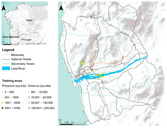 To represent the environmental heterogeneity on the study area, a total of 207 training areas were considered, covering river margins, mountainous areas, seaside, and urbanized spaces, always having the attention to record especially significant training areas (i.e., combining mixed pixels but most often heavily invaded areas which generate ‘pure’ pixels for training). Several sites representing the study area’s main land cover types (e.g., urban, forest, motorway, shrublands, and agricultural areas) were inspected to collect training samples. Through ground surveys and GPS equipment, sites invaded with considerable dimensions (>5 m2) were recorded and georeferenced (n = 67). Due to some locations’ inaccessibility, GIS tools and orthophoto maps with high-spatial-resolution (0.3 m) were used to obtain additional presence areas (n = 100). Additionally, through manual photointerpretation of high-resolution images, several areas representing the main land cover types for the study area were collected and used as absences (i.e., ‘true-absences’; n = 40). The overall median size of training areas is 188 m2, while the median size of presence areas is 112 m2 and 13,820 m2 for absence areas.