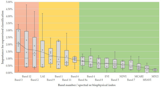 According to biomod2 ranking, the four most important variables were Band 3 (green), Band 12 (SWIR2), Band 2 (blue), and the LAI index. In opposition, the bands with lower importance were in the spectral region of red (band 4), red edge (bands 5, 6 and, 7), and the near infrared (bands 8 and 8a), often used for remote sensing of vegetation. Overall, the variable importance analysis highlighted the usefulness of the spectral bands on the classifier (with 78% of all information used) in contrast to the less performant vegetation and biophysical indices (with 22%) (Figure 3). Despite exhibiting lower importance scores and secondary contributions, the remaining variables also improved overall accuracy.