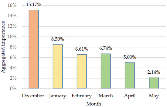 Relative importance by month obtained from the variable selection stage and sorted according to their aggregated scores (each color represents a similar amount of aggregated importance).