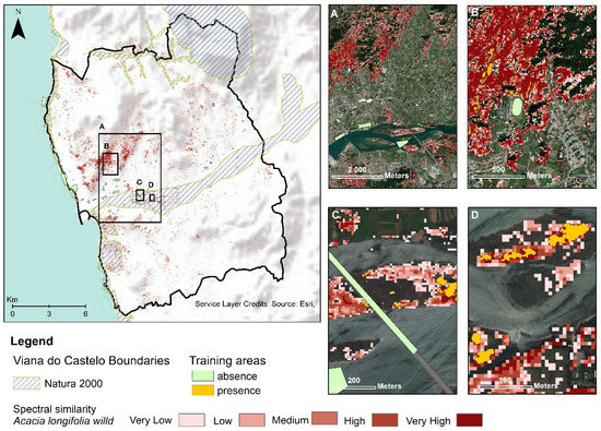 Map showing the distribution of invaded areas by the target species (colored pixels) obtained by the ensemble classifier. Inside these areas, the color ramp highlights the spectral similarity to invaded (train) areas, showing those spots with a potential greater likelihood of invasion or higher plant density/coverage. Training areas are shown in colored polygons in yellow color (presences) and light green (absences). Sub-areas A–D (left side) are shown in detail on the right side to depict different invaded sites from forest areas to wetlands in the stud area.