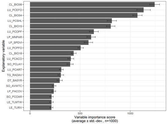 Importance scores for the 20-selected predictive variables calculated from the Random Forest model. Average (grey bars) and standard deviation values (‘whiskers’) are presented for the 1000 rounds performed with the random forests algorithm. Acronyms for predictor variables are presented in Table 2.