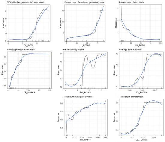 Partial dependence plots showing the relation between the response variable (abundance given by the percentage of invaded area in the y-axis) and the selected predictive variables of different environmental factors (x-axis). The black line indicates the “raw” response from the RF model, while the blue line applies a moving average smooth.