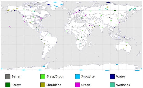This study uses the L8 cloud cover assessment validation dataset as the source for model training and validation [6,27]. The L8 Biome dataset includes 96 Landsat 8 images sampled across the world, and with a manually generated cloud mask for each image. The name Biome is given because the target scenes are sampled based on biome types. The path/row of the scenes covering the land are sampled across the world on the basis of biome types which include urban, forest, shrubland, grass/cropland, snow/ice, wetlands, and water. In order to create a heterogeneous dataset, path/rows with obviously clustering patterns are discarded and will be re-sampled from their biome types. Then scenes within the final set of path/rows will be labeled as clear, mid-cloudy, and cloudy manually based on the cloud coverage percentage within each scene. A total of 96 scenes are prepared covering 8 biome types in 3 cloud coverage levels as shown in Figure 1.