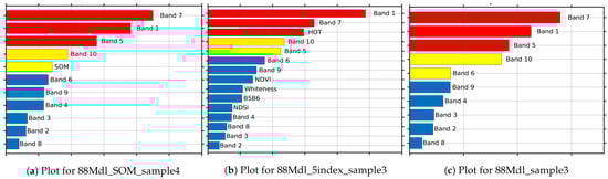 The importance plot for three best models, which are (a) the model trained on sample 4 with SOM as input, (b) the model with 5 indices trained on sample 3 and (c) the base model with 10 wavelength bands trained on sample 3. Model (a) has the best performance on all metrics in the intra-group, while model (b,c) has the best performance on omission error and correctness, respectively. Red and yellow bars represent the top 5 important features and blue bars represent the importance of the rest variables.