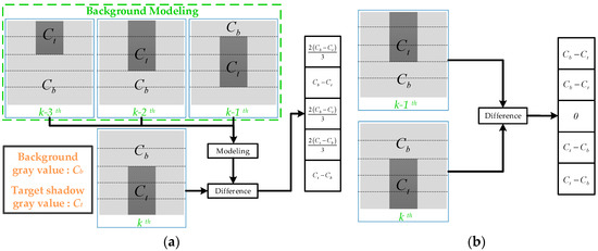 Principle of shadow extraction of difference-based MTD algorithms. (a) Principle of background difference. (b) Principle of frame difference. The blue rectangles represent frames.