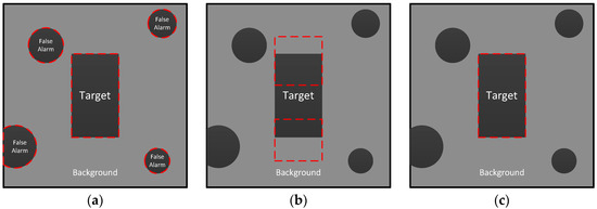 Schematic diagram of the proposed algorithm. The gray rectangles represent the shadow of the moving target, the gray circles represent false alarms from a low-RCS background, and the red dashed lines represent the detection boxes. (a) Results of background frame detection. (b) Results of multi-interval frame difference. (c) Result of fusion and threshold determination.