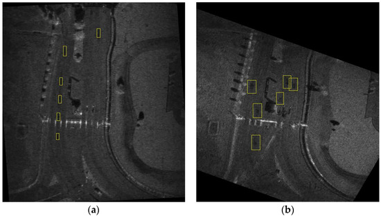 Results of detection of the shadow of a moving target on the ground in SNL VideoSAR data. The yellow rectangles highlight the shadow of the marked moving car. (a) The 23rd frame. (b) The 551st frame.