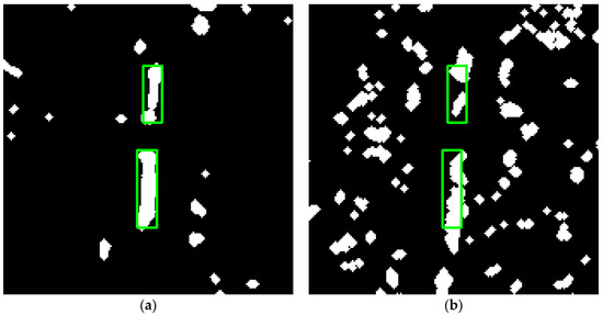 Comparison between the background frame detection algorithm and the multi-interval frame difference algorithm. The green rectangles represent the real position of the shadow of the moving target. (a) Result of the background frame detection algorithm. (b) Result of the multi-interval frame difference algorithm.