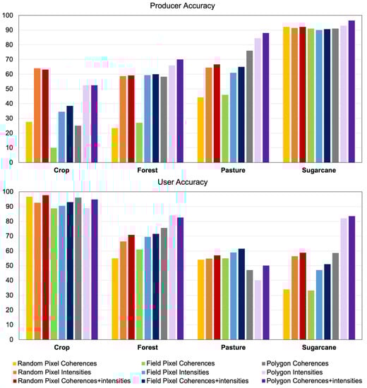- Field Sampling: This refers to object-based classification, as the samples correspond to the polygons themselves. The coherence magnitude and the backscatter intensity features are computed through multi-looking over the entire field. The differences with the field-pixels sampling are found in the impact of intra-field heterogeneities and in the different sensitivity to speckle noise. We are using the digitalized polygons (or objects or segments) from our ground surveying activities.