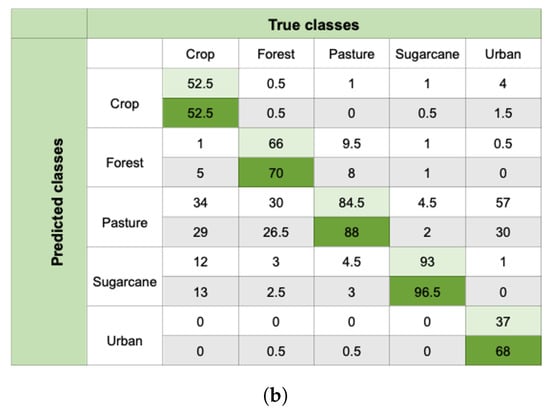 - Field-Pixel Sampling: In this approach, the pixels from the same polygon are entirely assigned either to the training or the validation set. For each class, the training set is built by iterative growth, i.e., by adding a field at a time to the set until 70% of the total pixels are allocated. The pixels from the excluded fields are assigned to the validation set.