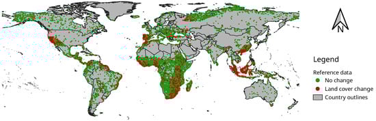 To measure the accuracy of break detection, we used the land cover change reference data that were collected by the International Institute for Applied Systems Analysis (IIASA) as part of the CGLS-LC100 project [31]. The reference dataset is visualised in Figure 2. It consists of 33,881 300 by 300 m sample sites worldwide, of which there are 2594 sites with land cover change (7.7%). Experts at IIASA collected the land cover change reference data by visual interpretation of very high-resolution and Sentinel-2 imagery of the years 2015–2018, assisted by time series of Sentinel-2, MODIS and PROBA-V vegetation indices. The reference data cover a broad range of land cover change, e.g., flooding, deforestation, agricultural expansion, land abandonment, etc.