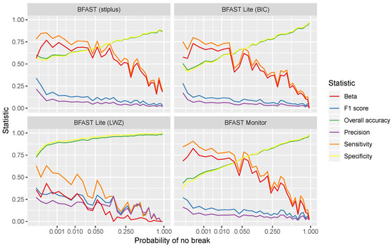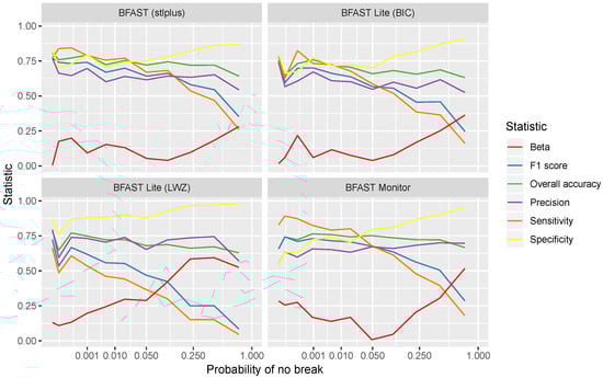 The results show that the statistics of all of the algorithms are close to one another and change consistently across the break confidence range. BFAST Lite with breakpoint number selection by LWZ is the only algorithm that stands out as different from the others. This shows that there is little difference between the algorithm results when comparable parameters (i.e., breakpoint selection by BIC) are used. However, the flexibility of BFAST Lite allows significant customisation of the algorithm when desired. When LWZ was used for selecting the number of breakpoints, it resulted in significantly better results: higher overall accuracy, F1 score, precision and specificity, as well as lower beta, throughout most of the range. However, it also had a lower sensitivity compared with other algorithms. This shows that break selection by LWZ makes the algorithm considerably more conservative, which means it does not overestimate the number of changes as often, albeit at the cost of some additional omission error.