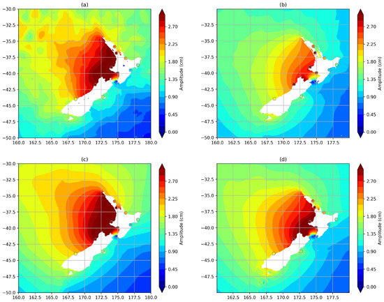 For the remaining constituents, EOT-I shows significantly larger RMS values compared to EOT-R. The results for , and J1 tides are consistent for all of the regions, implying the inference does not provide an accurate estimation of these tides. These results are in line with what has previously been shown for the J1 tide in Ray [16]. For the L2 tide, however, the picture is not as clear. In the Yellow Sea, EOT-I outperforms EOT-R, while in New Zealand and Australia, the results are vice versa. However, the inferred L2 tide shows an RMS that is more than double that of the EOT-R in Australia. With this high RMS, coupled with the overall larger RMS for EOT-I, it is recommended that the L2, as well as the remaining three tides, be directly estimated by the EOT model. When considering that EOT-R and FES2014 are optimised for the estimation of tides in the coastal region, the performance of TiME compared to the tide gauge observations exceeds expectations. TiME shows the lowest overall RMS for the MSF tidal constituent and is within 2 mm of the overall RSS estimations of the EOT-I and FES2014 models.