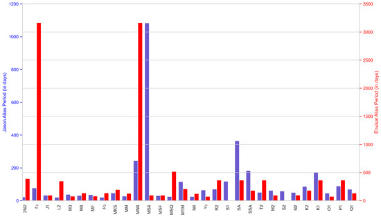 The alias period (in days) for all the tidal constituents available from FES2014, with the blue bars indicating the Jason orbit missions and the red bars representing Envisat orbit missions. The S1 and S2 tidal constituents of the Envisat orbit have an aliasing period of infinity due to their sun-synchronous orbit.