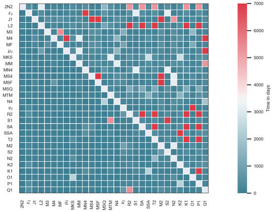 In this figure, the lower-left triangle represents the Rayleigh criteria (in days) of the Jason-series, while the upper-right triangle is that of the Envisat-series. For the Jason-series of data, the Rayleigh criteria is satisfied for all of the tidal constituents but this is not the case for the Envisat-series. Focusing on the minor tides that will be investigated later in this study, the Rayleigh criteria indicates difficulties in estimating the semi-diurnal solar T2 tidal constituents, as well as the and MSF tidal constituents. It can, therefore, be suggested that these tidal constituents may benefit from their inferences from their major tidal constituents, but inaccuracies in these tides may be compensated by the Jason-series, for which this is not an issue.