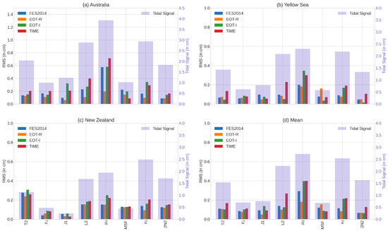 For all of the tide gauges presented, EOT-R shows a lower root-square-sum (RSS) compared to all of the tide models, but there are several constituents where the RMS is higher than that of the other models (Figure 4d). For the Australia and New Zealand regions, EOT-R shows a lower RSS compared to all of the tide models and shows relatively low RMS results for all of the constituents. In the Yellow Sea (Figure 4b), however, EOT-R shows a relatively poor RMS for the MSF tide, which results in the RSS in this region being slightly higher than the FES2014 model. Additionally, this is also the only region where EOT-R shows a higher RMS for the T2 tide compared to both EOT-I and FES2014.