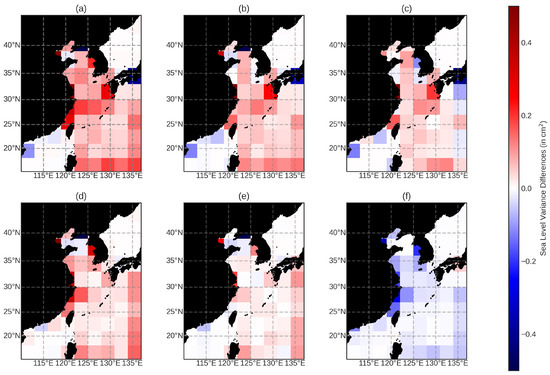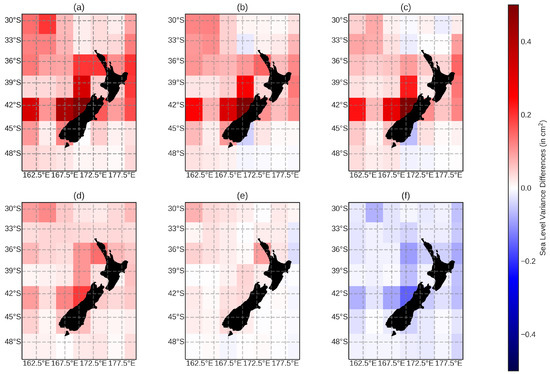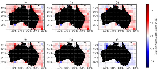 The sea-level variance differences between the scenarios presented for the Jason-2 altimeter in the Australia region. The subplots of sea-level variance differences are as follows: (a) modTiME–EOT-R; (b) modTiME–EOT-I; (c) modTiME–modFES; (d) modFES–EOT-R; (e) modFES–EOT-I; and (f) EOT-R–EOT-I. The figures are designed so that when the colours are blue, the first model has a lower variance, while when the regions are red, the first model has a higher variance compared to the second model.