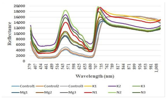In this NDVI study, an average reflectance value was calculated for the entire RED (~625 nm–~699 nm) range for each control leaf. These averaged values of RED were further averaged to produce a final value for all the control leaves in the RED range to obtain RED reflectance. Similar procedures were followed for the N.I.R. (~701 nm to 1000 nm) region. Applying the same method, the RED and N.I.R. reflectance for K-, Mg-, and N-deficient were calculated.