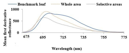Figure 5 presents the mean first derivative of the reflectance of healthy (benchmark leaf), and unhealthy (whole and selective areas) leaves between ~675 nm to ~775 nm. This figure demonstrates that the mean first derivative reflectance in the N.I.R. wavelength range is higher for unhealthy leaves compared to the benchmark leaf across the entire leaf surface. Narrowing of the reflectance curves for unhealthy leaves is evident for the whole area compared to the benchmark leaf. A shorter wavelength shift of the peak is also observed for unhealthy leaves compared to benchmark leaves. Reflectance is insensitive to changes in chlorophyll content but sensitive to internal leaf structure, water content, structural compounds and altered internal mesophyll structure [41,42] as in the case of the formation of necrotic areas due to tissue decay. Therefore, the deviation of the mean first derivative reflectance curves of unhealthy leaves compared to the benchmark leaf could be due to these differences in internal leaf structures.
