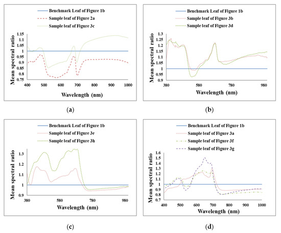 Figure 6c compares an unhealthy leaf with brown spots and holes with an unhealthy leaf with brownish regions and holes and shows similarly shaped ratio curves. The reflectance ratio of the former is higher than the latter in the ~400 nm and 1000 nm wavelength range.