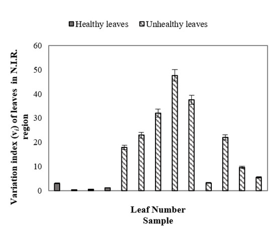 Figure 7 demonstrated the variation index (vi) of healthy and unhealthy leaves in the N.I.R. region (700+ nm to ~1000 nm) where error bars were used to distinguish unhealthy leaves from healthy leaves. As in the previous study, the benchmark leaf was considered as the reference healthy leaf. From Equation (1) it can be stated that the variation index indicates the percentage of the average value of SDs of reflectance of healthy and/or unhealthy leaves differ with respect to the average value of SD of the benchmark leaf. Figure 7 demonstrates that healthy leaves have vi indexes closer to the benchmark leaf, whereas, unhealthy leaves have a higher vi index value at the N.I.R. region, indicating the difference between healthy and unhealthy leaves. Variation indexes for healthy and unhealthy leaves were also calculated using a similar procedure in the UV and VIS regions. However, no such prominent patterns were observed for unhealthy and healthy leaves in the UV and VIS regions (not presented in this manuscript).