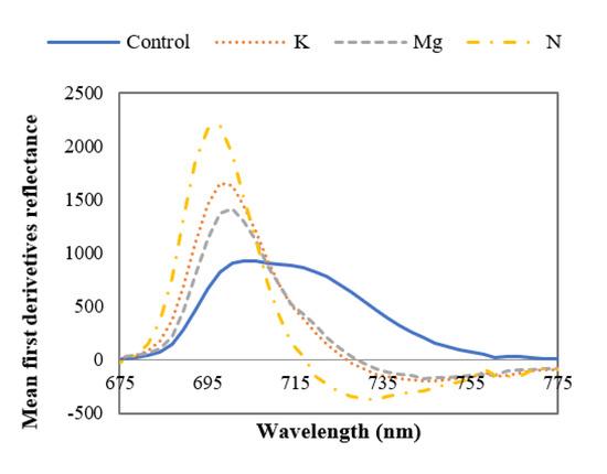 From Figure 8, it can be stated that the ~700 nm derivative peaks are dominant in leaves with nutrient deficiencies, and these results are supported by published findings [43,44]. Narrowing of the first derivative reflectance peak can also be observed for the nutrient-deficient leaves compared to control leaves. The midpoint of this broadened peak is at ~ 708 nm for control leaves. This broadening and narrowing of first derivative peaks for control and nutrient-deficient leaves respectively could be due to the amount of chlorophyll content in the leaves. In this region, the first derivative peak magnitude is ~15%, ~ 9% and 7% higher for N-, K- and Mg-deficient leaves respectively in comparison to control leaves. From Figure 8, it can also be observed that in this wavelength range the first derivative peak of nutrient-deficient leaves has shifted to the shorter wavelength (redshift) compared to the control leaves. It was reported that this shift occurs if vegetation is exposed to low nutrients or environmental stress [43]. No notable curve pattern (broadening or narrowing) of the mean first derivative reflectance was found in the ~380 nm to ~675 nm range to distinguish control and nutrient-deficient leaves.