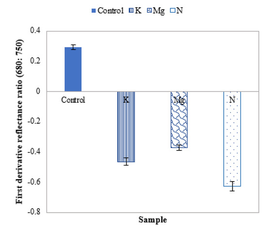 Mean first derivative reflectance ratio plots between 680 nm and 750 nm could be employed to distinguish control, and nutrient-deficient leaves as this ratio is positive for control leaves and negative for nutrient-deficient leaves. Furthermore, the magnitude of this ratio of different nutrient-deficient leaves could be utilised to identify leaves with N, K and Mg deficiencies.