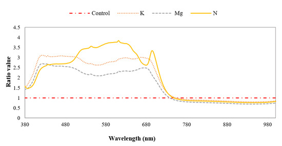 Mean spectral ratios of different nutrient-deficient leaves to control leaf, distinguishing individually different nutrient-deficient leaves.