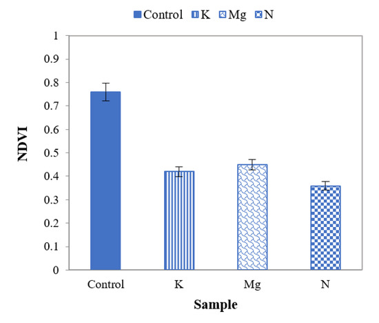 From NDVI values of Figure 11, it can be observed that they are higher for control leaves than those of nutrient-deficient leaves. These values indicate that control leaves are healthier than leaves with N, K and Mg deficiencies. It is also aparent that the NDVI values for leaves with N, K and Mg deficiencies are not notably different from each other.