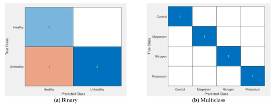 Furthermore, a confusion matrix (Figure 14, (a) binary and (b) multiclass) was used to visualise the performances of the proposed technique. A confusion matrix summary is presented of the number of samples correctly and incorrectly identified and separated into each class with a number, where the diagonal and off-diagonal elements represent correctly and incorrectly identified samples respectively. It should be mentioned here that we are presenting only one group of experimental results and the average result of three iterations is shown in Table 3.