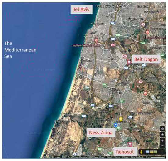 Our field campaign was held in Ness Ziona, Israel, during 3–6 January 2021. The location is about 8 km east of the Mediterranean Sea and is characterized by flat terrain (see Figure 3).