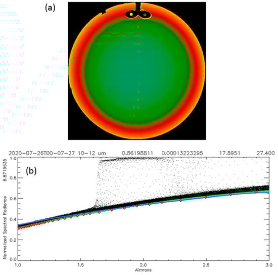 An example of JPEG qualitative images that are produced by the sensor for a quick look at the sky conditions. (a) An image of a midsummer clear sky from 26 July 2020 in a color scale of the brightness temperature. The scale runs from yellow-orange-red-green-blue from high to low temperatures respectively. The full-color scale in this image corresponds to a brightness temperatures span of about 230–300 K (red is hot). The non-valid pixels appear in black. The calibration mast with two blackbodies is visually observed on the top of the image. (b) A visual graph of the corresponding scatter plot of the brightness temperature (expressed as normalized radiance with respect to ground level temperature) as a function of air mass is used for clear sky estimation. The three-color lines correspond to the different clear sky radiance estimation methods which typically overlap each other at clear sky conditions. It should be noted that these images do not hold quantitative data, and are used only for basic interpretation and for the analysis of the spatial and temporal evolution of the cloud and fog field. The quantitative data were used for obtaining the results depicted in Figures 9–11.