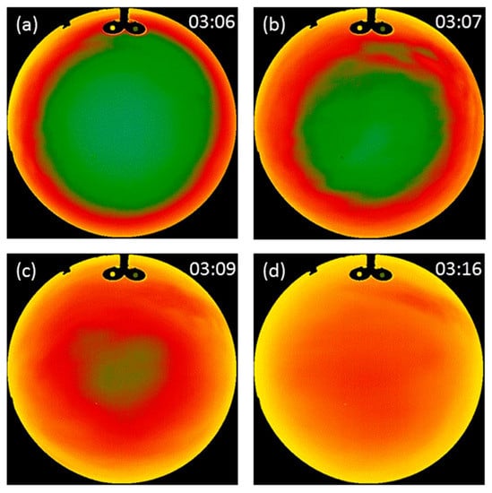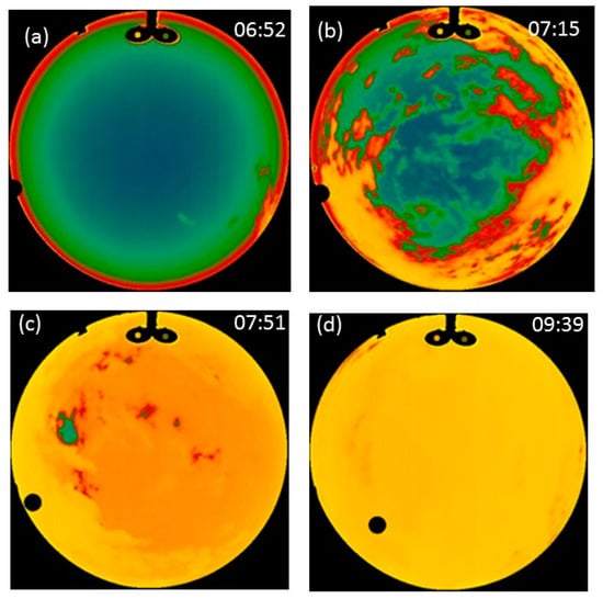 Sky image at 4 January 2021. (a) 03:06—the fog is low and the whole sky image is clear. (b) 03:07—the fog is rising rapidly as indicated by the increased brightness temperature of the sky at low elevation angles. (c) 03:09—the fog continues to rise, but the clear sky is still present near the zenith. (d) 03:16—the fog covers the entire sensor’s field of view, but not very densely, as the sky image is not completely homogenous.