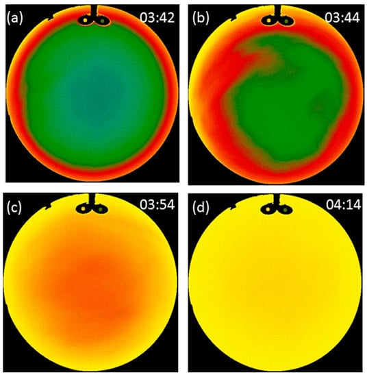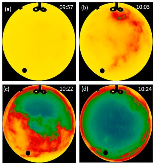 Sky image on 6 January 2021. (a) 03:42—the fog is low and the sky image is clear. (b) 03:44—the fog is rising rapidly. The slight asymmetry shows that the fog developed from the northeast direction. (c) 03:54—the fog covers the entire sensor’s field of view, but not very densely. There is still a temperature gradient that follows the elevation angle. (d) 04:14—Fully developed dense fog. The sky brightness temperature is homogenous and its magnitude is the same as the air temperature.