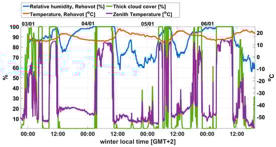 Relative humidity and air temperature along with the zenith temperature and thick cloud cover, during the January 2021 event, taken from “Rehovot” station. The X-axis time label denotes time- noon or midnight/date between 3–7 January 2021.