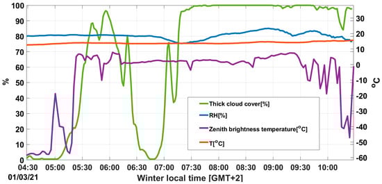Cloud cover and zenith brightness temperature report during 1 March 2021, calculated from WSI data. The relative humidity and the air temperature are obtained from the sensors embedded in Asis1i.
