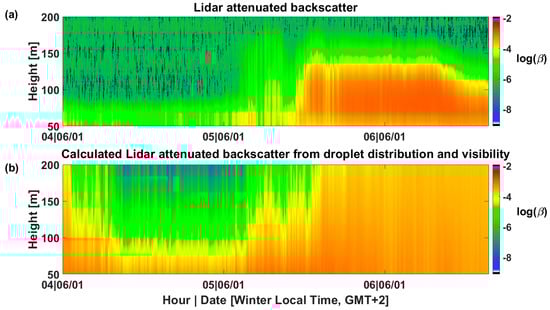 The other application uses the Lidar potential to analyze fog properties, as for example in the work of Gultepe, et al., who presented measurements of Doppler Lidar to characterize fog []. In the current work, we validate the use of a Doppler Lidar as a monitoring tool for fog events, by comparing the measured attenuated backscatter profile with the calculated one. We show that the Lidar equation, calculated based on surface-level measured droplets-size distribution, reproduces well the measured signal. This result demonstrates the ability of the Doppler Lidar to monitor fog without additional instruments.