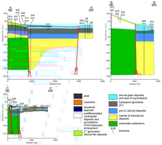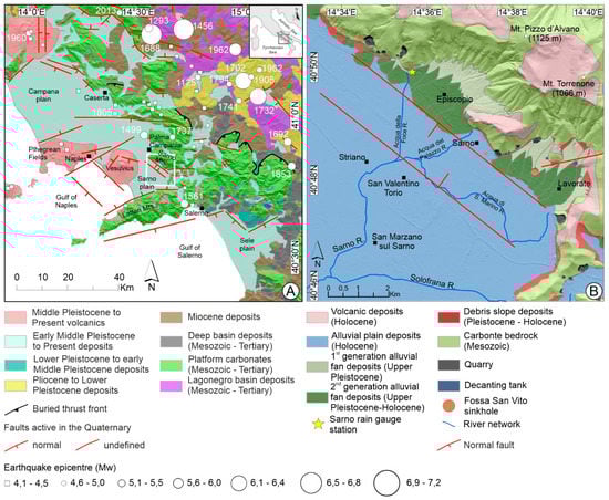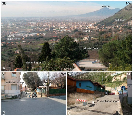 - Valente, E.; Ascione, A.; Santangelo, N.; Santo, A. Late quaternary geomorphological evolution and evidence of post-Campania Ignimbrite (40 ka) fault activity in the inner sector of the Sarno plain (Southern Apennines, Italy). Alp. Mediterr. Quat. 2019, 32, 185–197. [Google Scholar] [CrossRef]