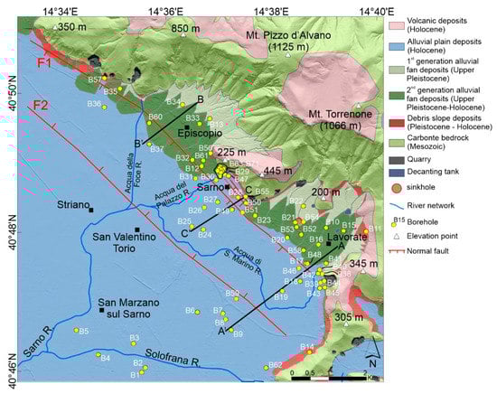 - Guarino, P.M.; Nisio, S. I sinkholes del settore nord-orientale della piana del F. Sarno: Ulteriori dati relativi all’assetto litostratigrafico del sottosuolo. In Atti 2° Workshop Internazionale “I Sinkholes: Gli Sprofondamenti Catastrofici nell’Ambiente Naturale ed in Quello Antropizzato”; ISPRA Servizio Geologico d’Italia: Rome, Italy, 2009; pp. 541–551. [Google Scholar]